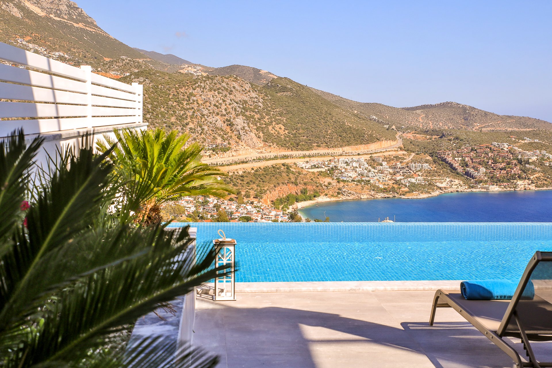 Situated in an elevated position behind beautiful olive groves, the villa provides uninterrupted views of the sea, town, and mountains. It is conveniently located a 15-minute walk from Kalkan center.
