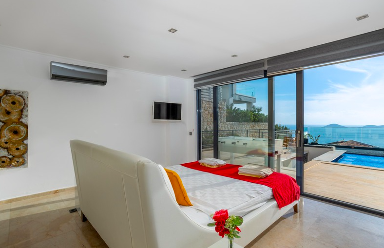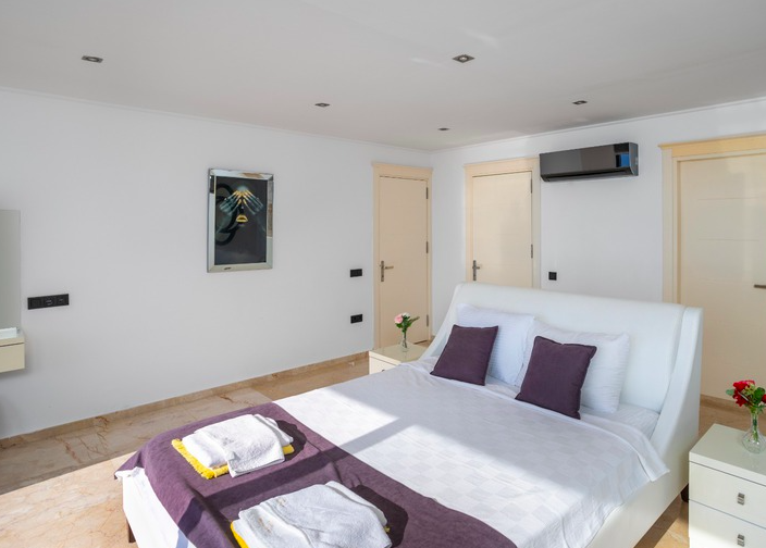 Located on this level, the first double bedroom offers an en-suite shower room with twin basins, built-in wardrobes, and a wall-mounted TV. Sliding doors open onto the pool terrace, offering stunning views of Kalamar Bay.